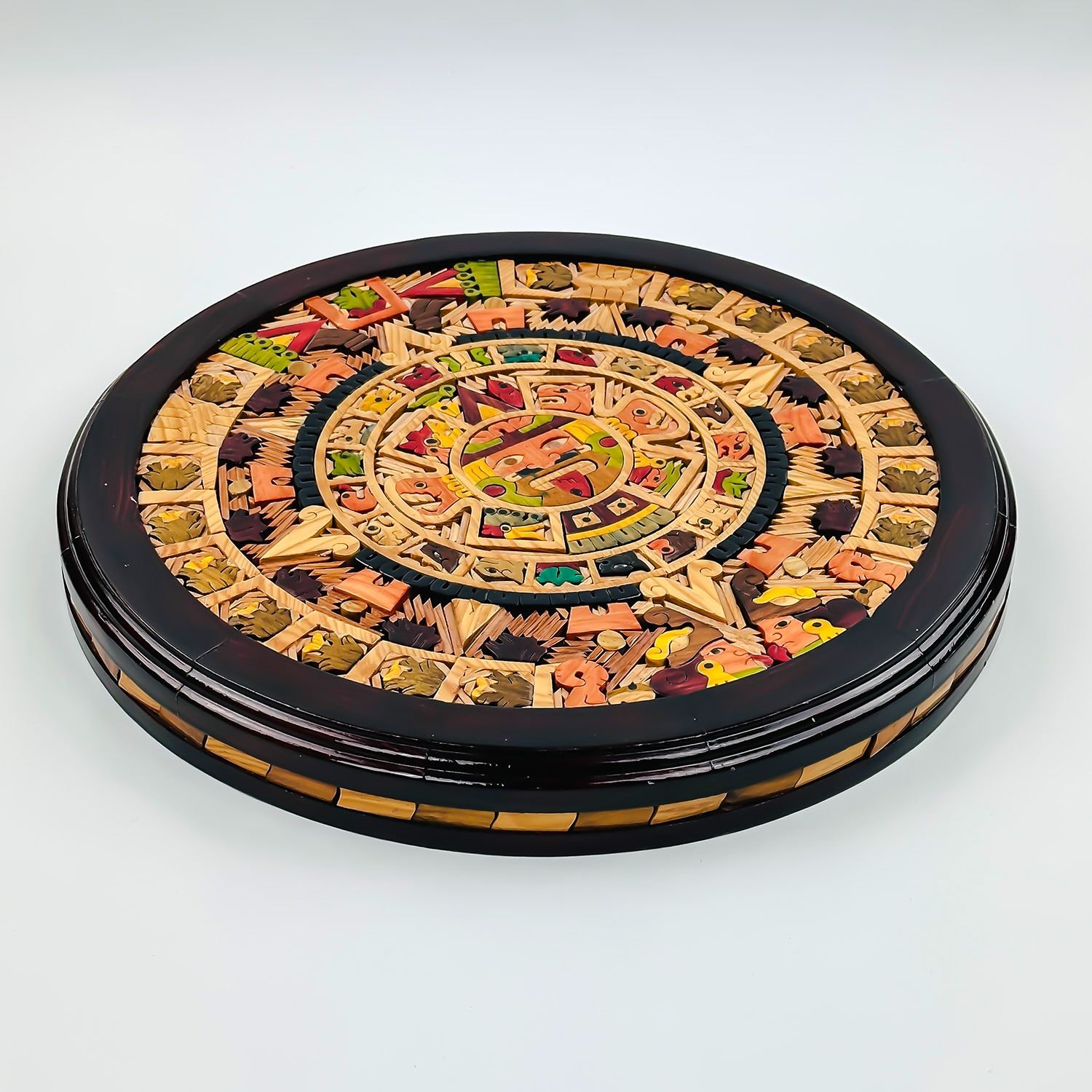 LARGE WOOD INLAY AZTEC MAYAN CALENDAR SCULPTURE