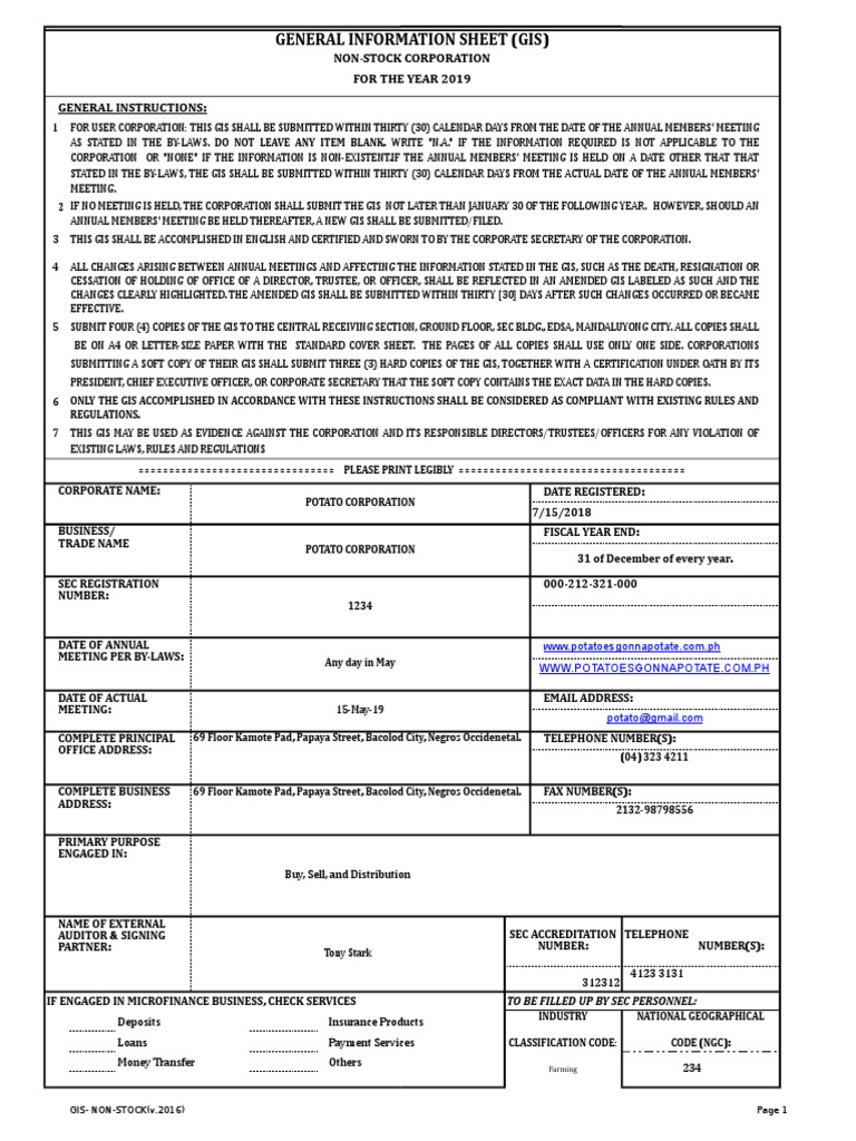 SEC General Information Sheet Stock Corporation