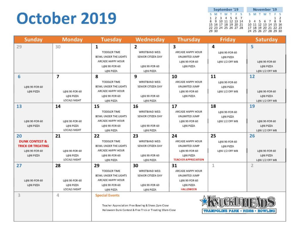 Calendar of Events KNUCKLEHEADS * TRAMPOLINE PARK * RIDES * BOWLING