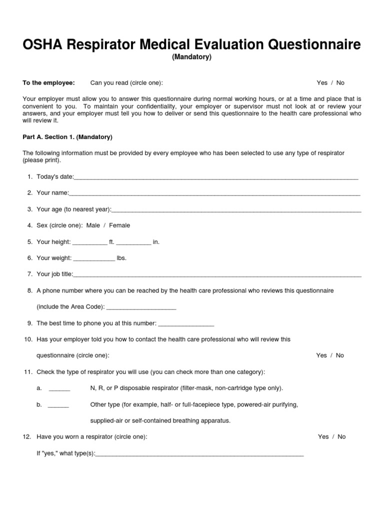Web osha respirator medical evaluation questionnaire. Pulmonary function test (pft) no; Web check the type of respirator you will use (you can check more than one category): Web the medical evaluation is a questionnaire located in appendix c of the osha respiratory protection standard that the employee completes.