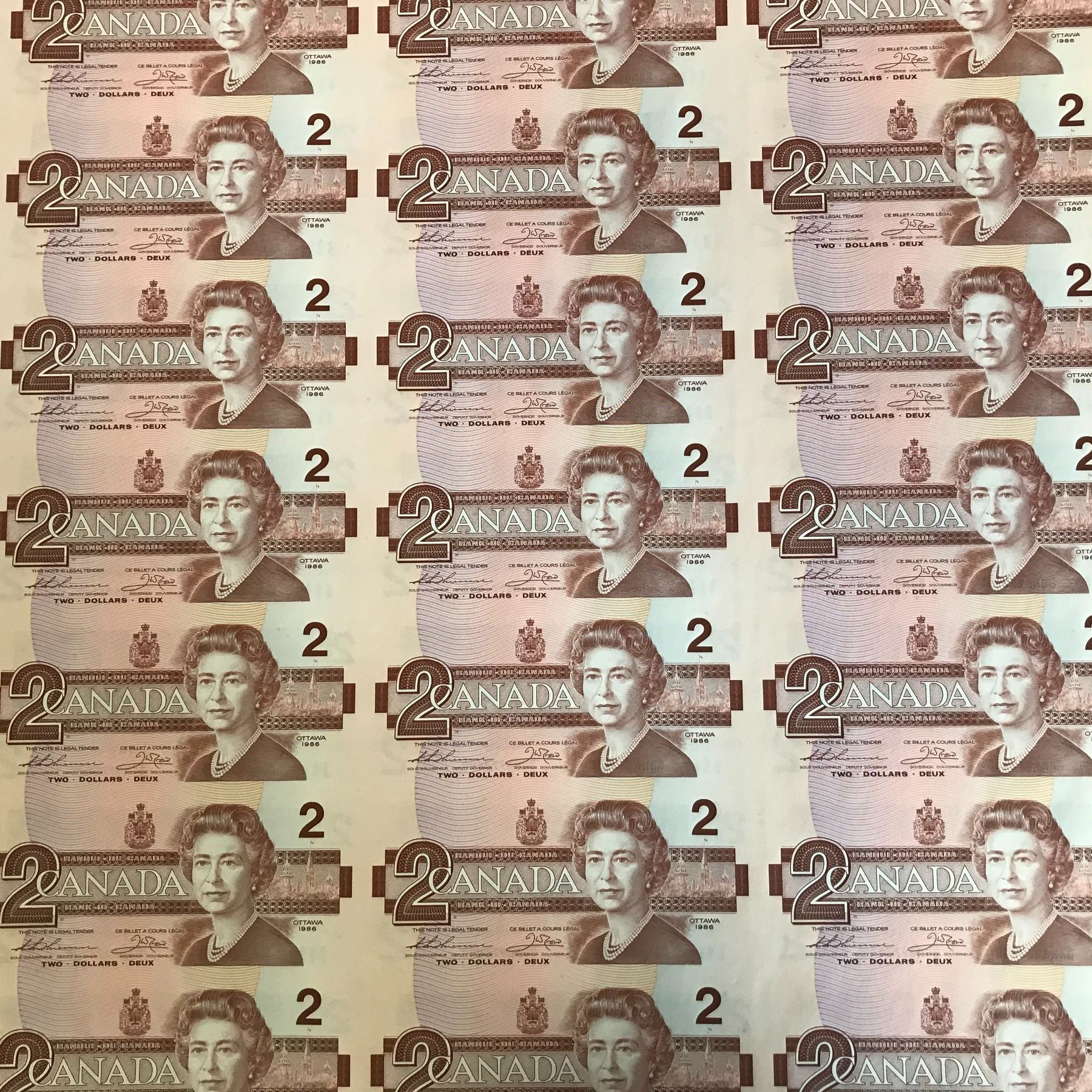 UNCUT SHEET OF 1986 CANADIAN 2 DOLLAR BILLS (UNCIRCULATED)